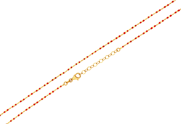 Veľmi jemná dámska retiazka je vyrobená zo 14-karátového žltého zlata. Retiazka je tvorená z lesklých, podlhovastých, valcovitých očiek, ktoré sú doladené červenou šperkárskou farbou.  Zapínanie je na bezpečnú karabínku a dĺžka je regulovateľná od 44 cm po 47 cm. Ide o naozaj nadčasový a štýlový kúsok ktorý oživí Váš outfit.