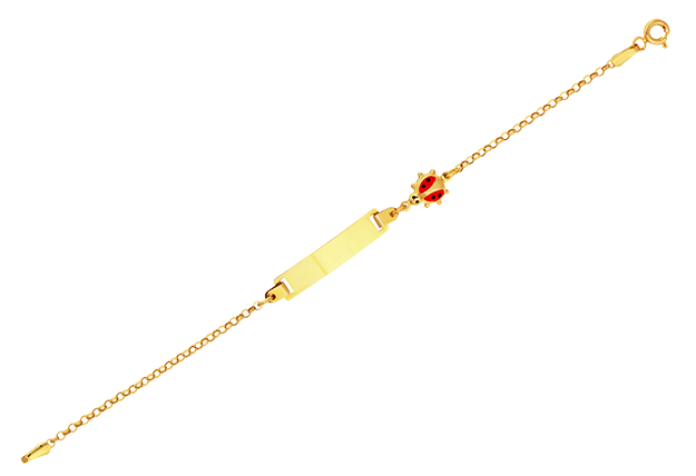 Jemný detský náramok je vyrobený zo 14-karátového žltého zlata. Náramok je tvorený retiazkou z malých okrúhlych očiek (Rolo) a stred náramku je zdobený s platničkou, vedľa ktorej je zakomponovaná menšia, vypuklá lienka. Zapínanie je na perový krúžok. Tento decentný náramok je vhodný ako darček na rôzne príležitosti.