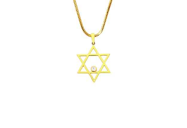 Jemný prívesok je vyrobený zo 14-karátového žltého zlata s povrchovou úpravou vysokého lesku. Prívesok je v tvare šesťcípej hviezdy pozostávajúci z dvoch rovnostranných trojuholníkov, doplnený s jedným okrúhlym krištáľom.